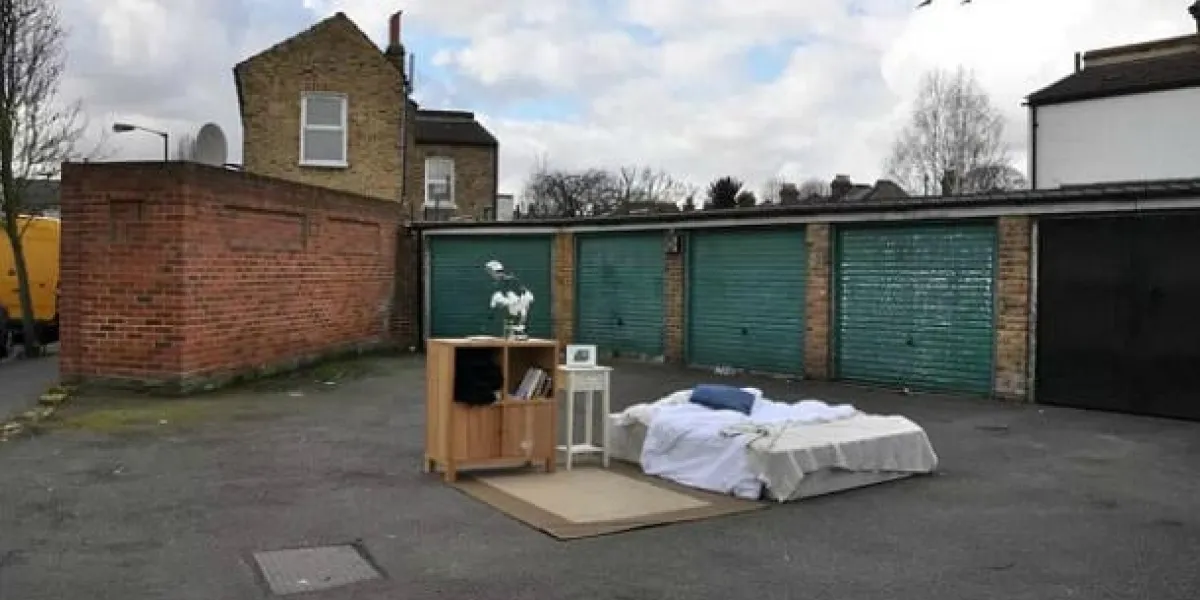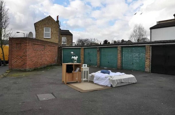 Ce "logement" situé dans le quartier de Peckham, près de Londres, est en fait un simple lit deux places accompagné d’un meuble de rangement et d’une table de chevet… Le tout en extérieur et à quelques mètres de garages. Une annonce complètement glauque proposée à 8 livres sterling la nuit, soit un petit peu plus de 10 euros. Mais des avantages étaient pourtant énoncés : un parking gratuit et les animaux autorisés !