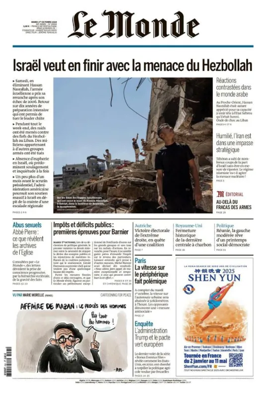 Ce matin, Le Monde aborde les attaques répétées ces derniers jours d'Israël au Liban. "Israël veut en finir avec la menace du Hezbollah" est-il titré. Le pays a par ailleurs annoncé officiellement, hier en fin de journée, vouloir attaquer le Liban par le biais de "raids terrestres localisés" et indique viser des "menaces directes (...) près de la frontière". La crainte d'une escalade régionale est forte et des millions de civils tentent de fuir et de se mettre en sécurité. L'armée israélienne a par ailleurs éliminé Hassan Nasrallah ce samedi, le secrétaire général du Hezbollah.