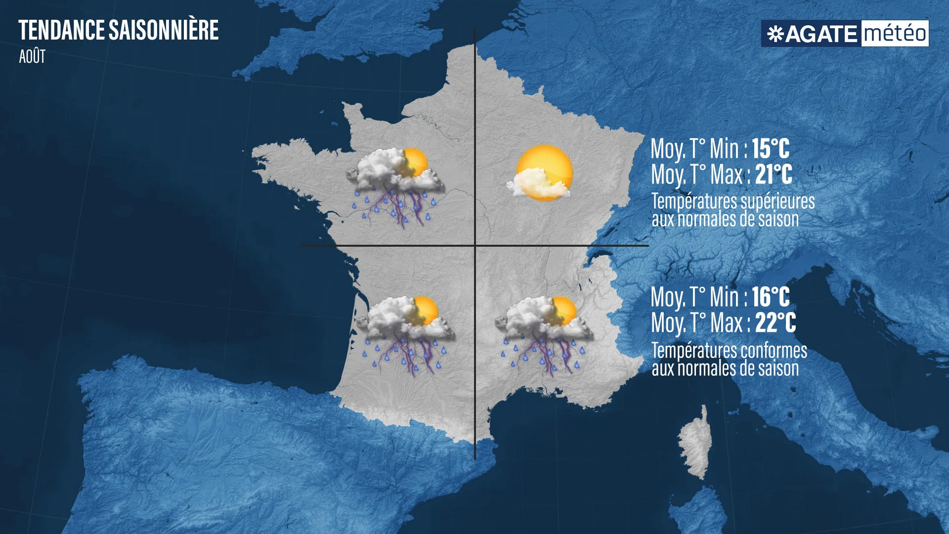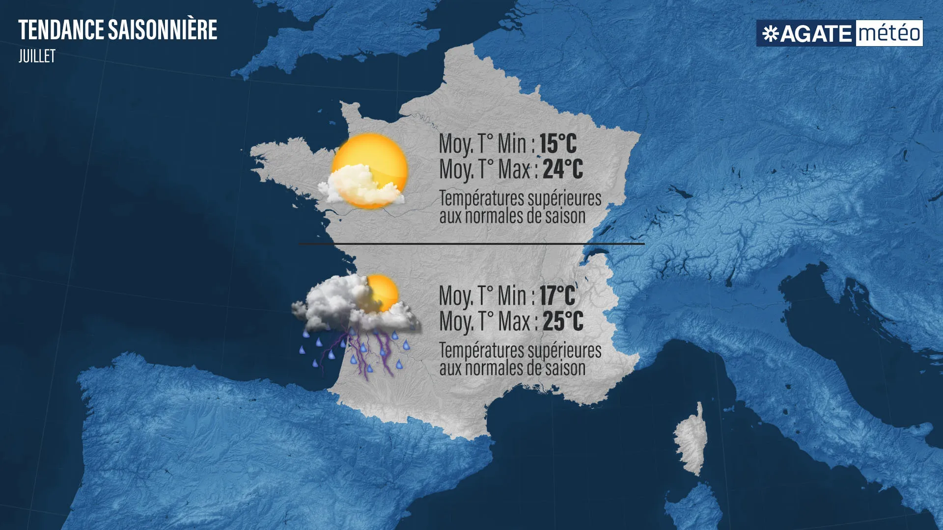 Les premières tendances du mois de juillet laissent entrevoir "une France coupée en deux". Selon Patrick Marlière, il faut s’attendre à "une moitié Nord où les hautes pressions devraient persister, garantissant du soleil mais un manque d’eau accru, et une moitié Sud où les pressions devraient être le plus souvent basses, ce qui se traduira par de l’instabilité caractérisée par des orages". Les températures resteront au-dessus des normales de saison durant le mois de juillet, "tant sur la moitié nord que sur la moitié Sud, mais cet excédent thermique sera moins prononcé en ce mois de juillet qu’en juin", ajoute le météorologue d’Agate Météo. Faut-il partir au mois d’août pour avoir un meilleur temps ?