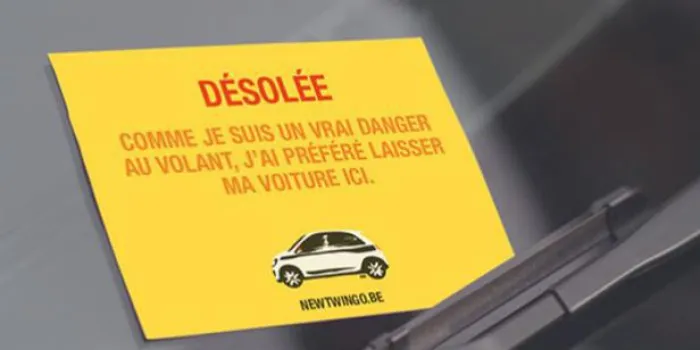 Mais ce n’est pas tout. Parmi les cartes "mots d’excuse" proposées, les clichés dégradants pour la gente féminine vont bon train. À titre d’exemple nous choisirons : " Désolée, comme je suis un vrai danger au volant, j’ai préféré laisser ma voiture ici ". Peut-être que Renault s’est inspiré des places de parkings chinoises, plus larges et peintes en rose, pour les femmes.