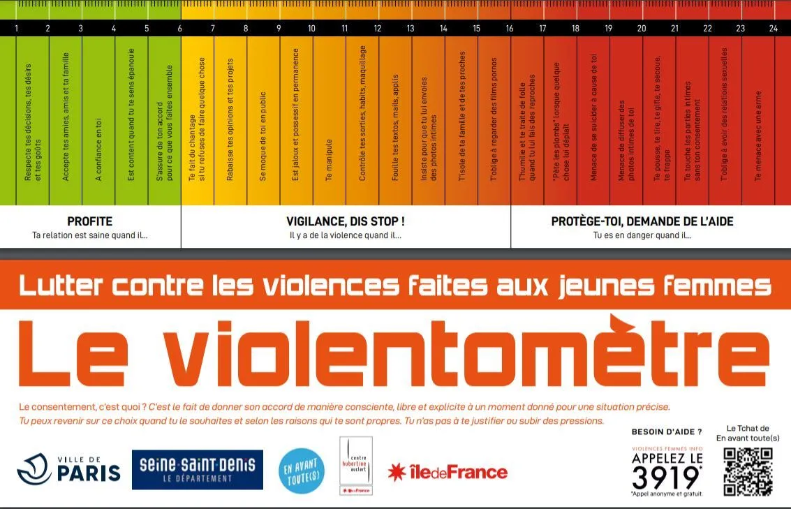 - "Protège-toi, demande de l’aide" : comportements dangereux tels que la jalousie, la manipulation, les violences physiques ou les menaces de viol.