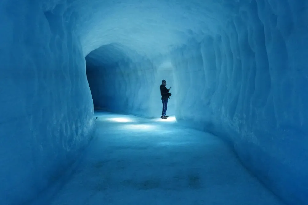 L'atmosphère y est incroyable, avec des lumières bleutées qui éclairent la glace. Ce tunnel géant de 550 mètres de long a même une chapelle. Il est possible de faire des concerts, des fêtes et même de s'y marier.