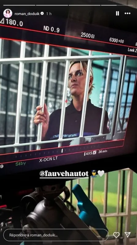 Le comédien Roman Doduik a partagé cette photo dans sa story Instagram, mercredi 18 septembre 2024, où l’on aperçoit Fauve Hautot en tournage dans cet uniforme de gardienne de prison, pour son nouveau rôle à la télévision.