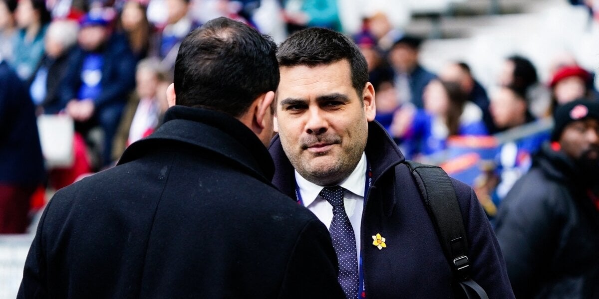Matthieu Lartot photographié en compagnie du sélectionneur du XV de France, Fabien Galthié, lors de la finale du Top 14 au Stade de France en 2018.