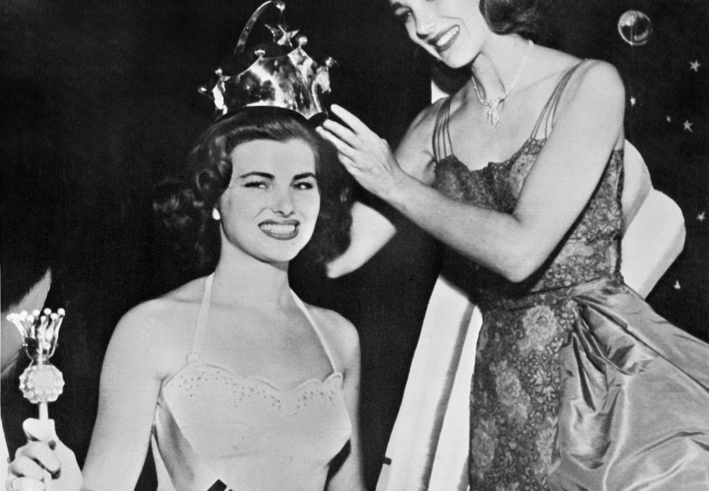 miss france christiane martel who was elected miss univers is crowned by us actress julia adams in long beach, california, 18 july 1953 (photo by afp)