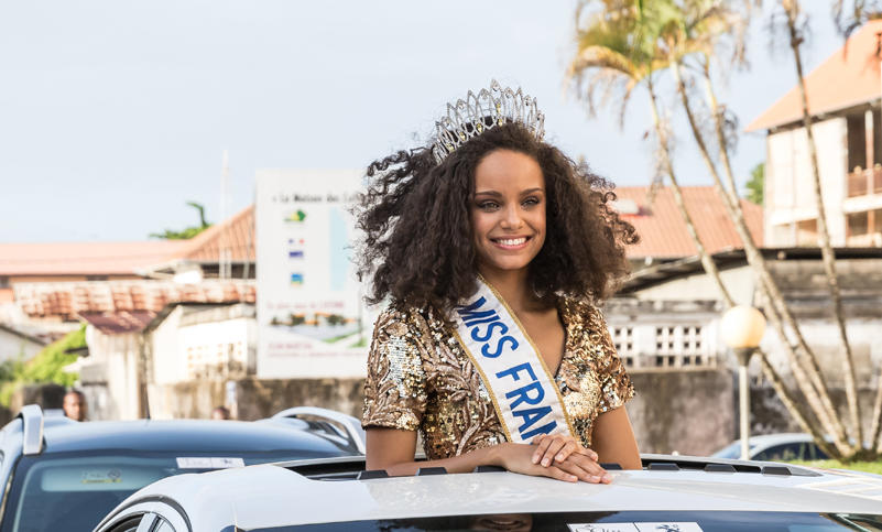 miss guyana 2016 et nouvellement élu miss france 2017 alicia aylies, regarde comme elle défile dans une voiture le 9 janvier 2017 à cayenne sur le département de la guyane (guyane) afp photo jody amiet
