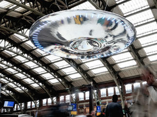 les gens marchent par ovni une oeuvre de l'artiste britannique ross lovegrove exposée à la gare de lille dans le cadre du fantastique festival de lille, le 5 octobre 2012 à lille, dans le nord de la france afp photo philippe huguen