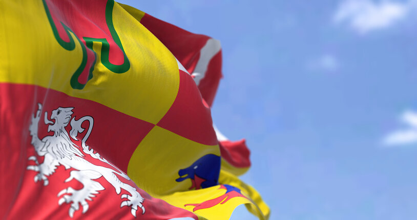 the flag of auvergne-rhone-alps flying on a clear day auvergne-rhone-alpes is one of the regions of france