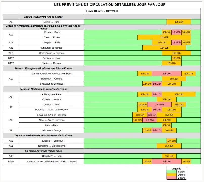 Ce lundi 18 avril, des embouteillages sont enfin attendus dans le sens des retours, puisqu'il est classé orange sur tout l'Hexagone. Bison Futé conseille ainsi de rejoindre ou de traverser la région parisienne avant la mi-journée et d’éviter les grands axes jusque tard dans la soirée. Dans le sens des retours, les difficultés débuteront à la fin de la matinée au plus près des zones côtières du pays et se rapprocheront petit à petit des grandes métropoles. Les difficultés devraient disparaître vers 20 heures aux abords de ces métropoles.